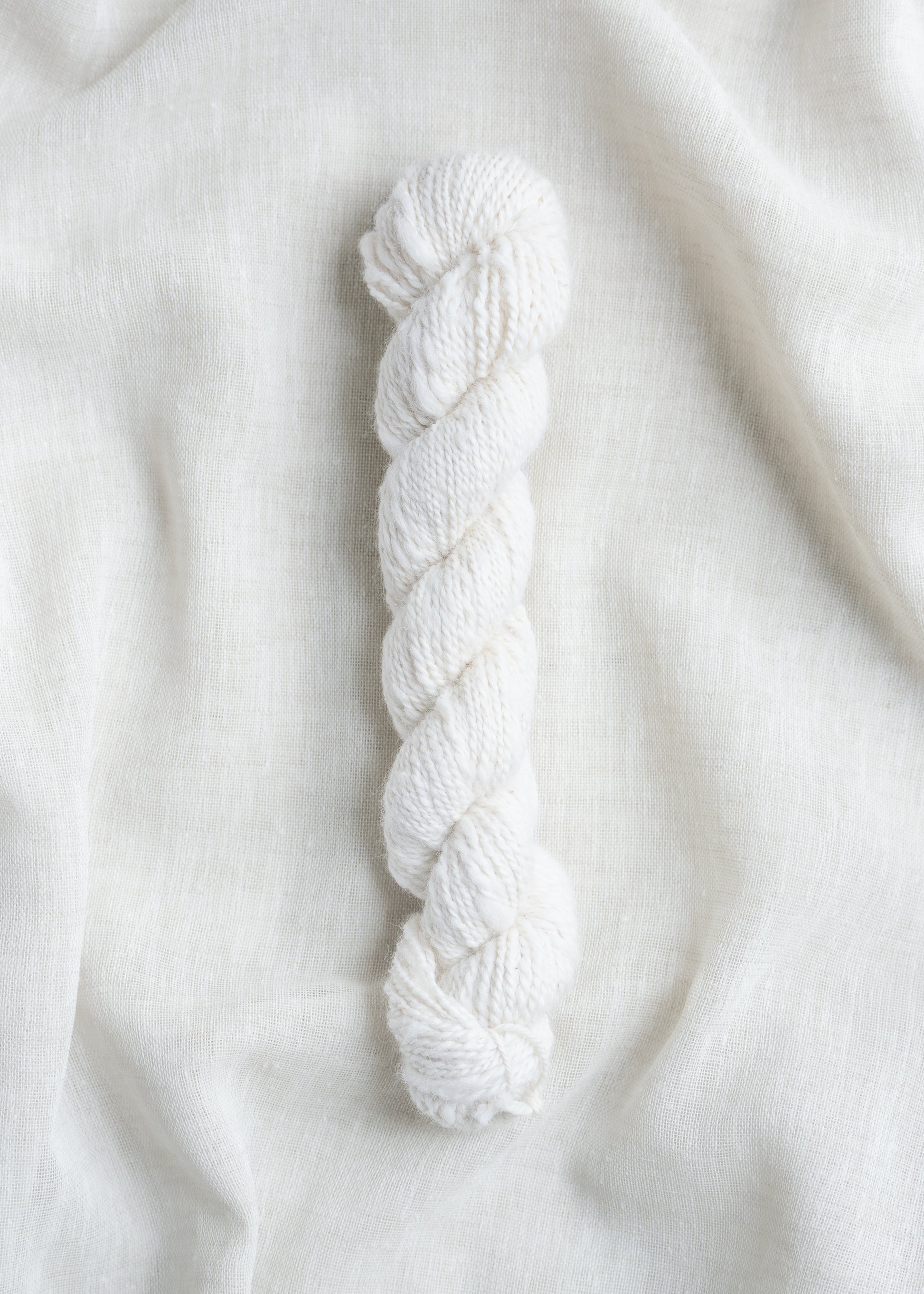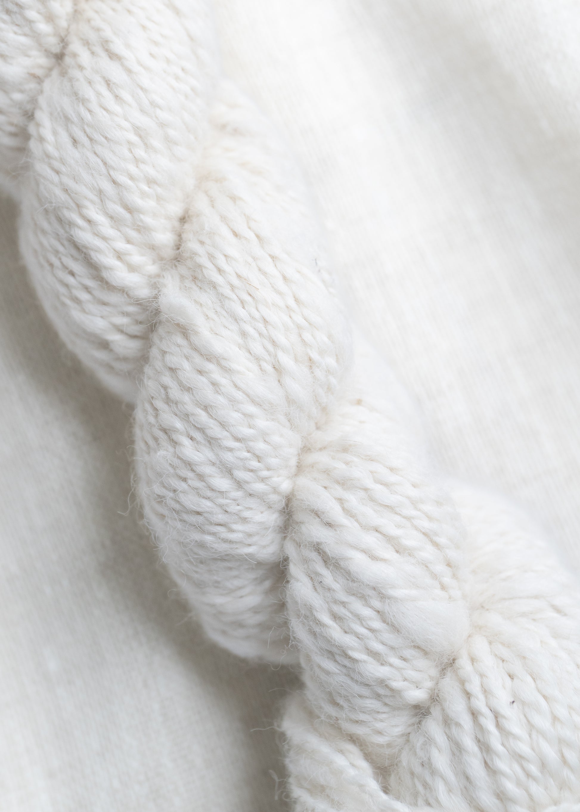 Dette er et tykt, mykt garn med struktur. Passer fint til løst, glattstrikket plagg.